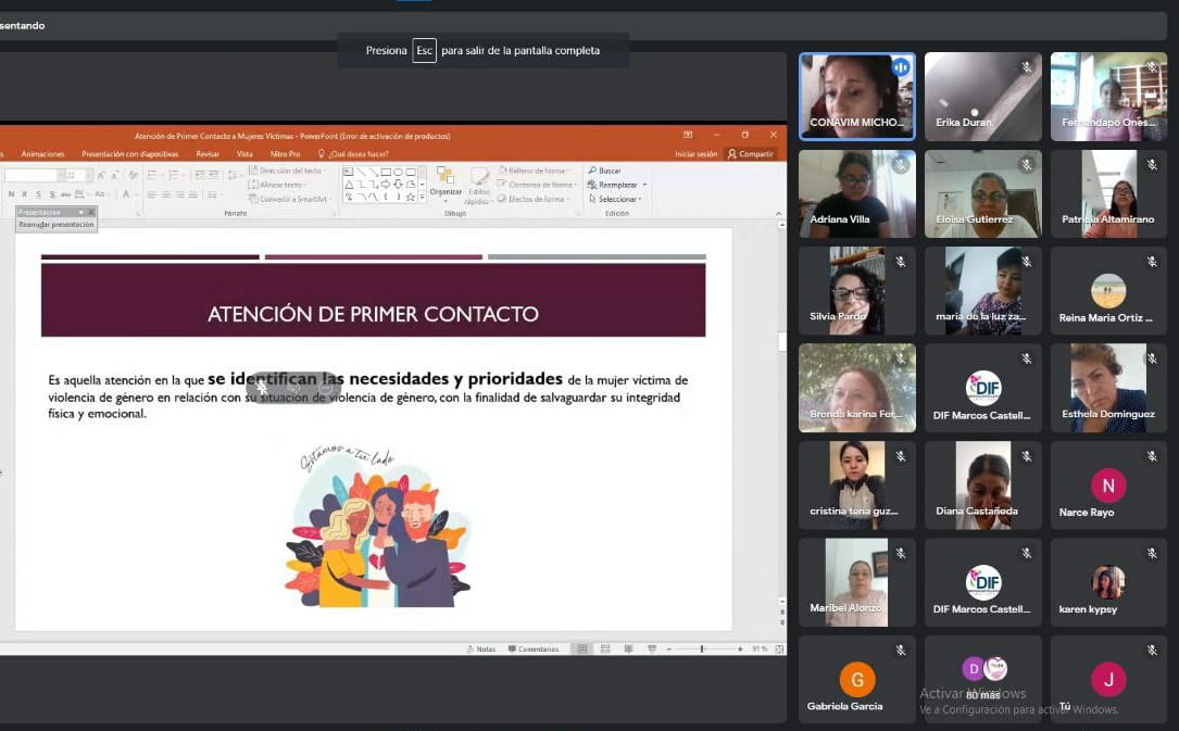 Fueron 120 profesionistas del área jurídica, psicológica y de trabajo social de los Centros Fijos del Programa de Apoyo a las Instancias de Mujeres en las Entidades Federativas (PAIMEF), así como directoras de las Instancias Municipales, quienes recibieron la capacitación virtual sobre la atención presencial de primer contacto a mujeres víctimas de violencia.